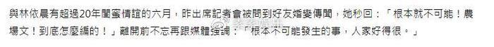 与林依晨有超过20多年交情的好闺蜜六月,在14日出席新闻发布会被问到林依晨婚变的传闻时,她也是秒回:根本就不可能啦,全是假的,到底是怎么编出来的。人家好得好啦,好不好!