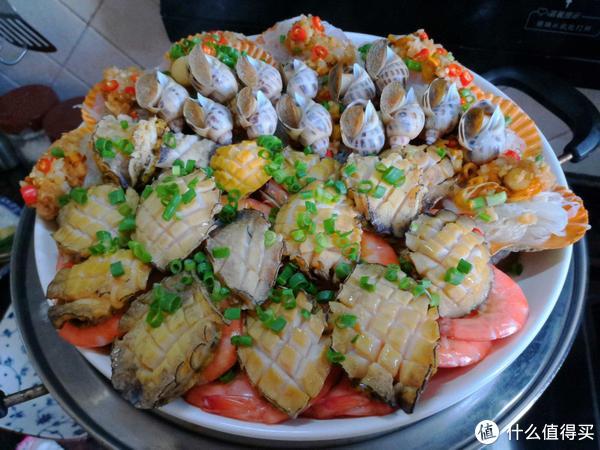 拼盘其他食材蒸好,提前把花螺冷水下锅,烧开后煮一分钟,依我的经验,看到螺肉从壳里凸出来就说明其熟了,倒出来,摆放拼盘上面,撒上葱花,淋入味汁(花生油勾兑蒸鱼豉油或靓生抽),扣盖闷十秒即可开吃。