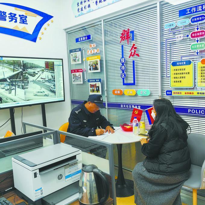 蓝天社区辖区面积0.86平方公里,有居民楼130栋,实有人口1.9万余人,治安情况复杂。为推动基层治理模式向事前预防转型,普阳街派出所在蓝天社区建立社区警务室,通过落实“社区民警在社区”的工作机制,切实将警务室打造成为服务群众的窗口、调处矛盾的阵地、打防犯罪的哨所。