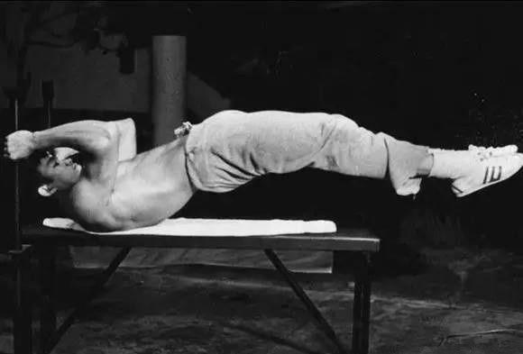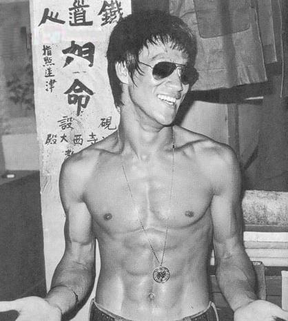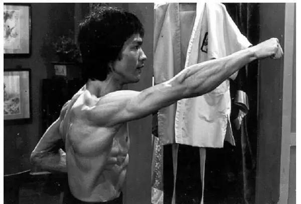 【李小龙在电影片场】李小龙练过、咏春拳、螳螂拳、洪拳、少林拳、戳脚、节拳、白鹤拳等拳种,这种包罗万象的练习,为后来创立截拳道奠定了基础。李小龙的体脂仅3%,这比顶尖运动员还要低。