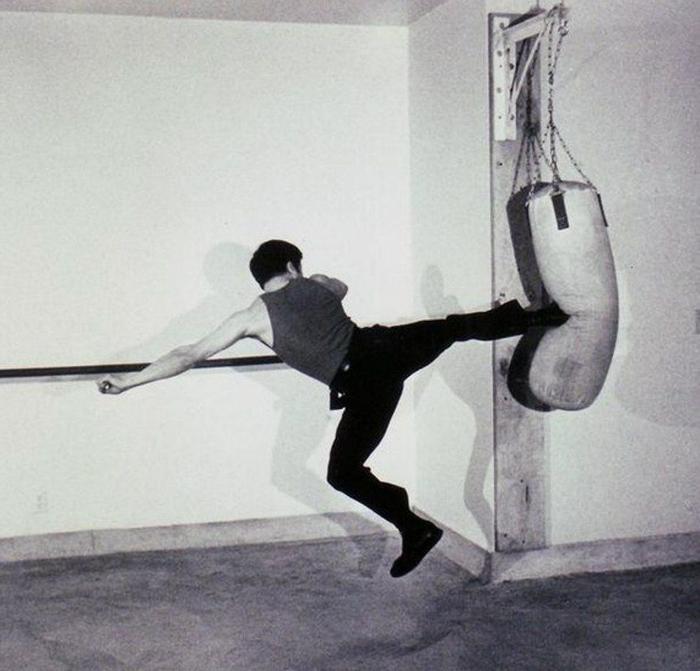 【李小龙表演用侧踢,可以把一只45公斤的沙袋瞬间踢破】肌肉爆炸力使得李小龙在1秒钟内可以踢6次腿,以其招牌动作“垫步侧踢”,把一个身穿护甲的200磅壮汉踢出去20米,落入游泳池中(这点有夸张成分)。