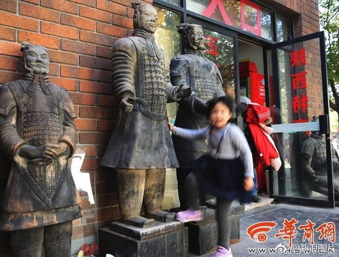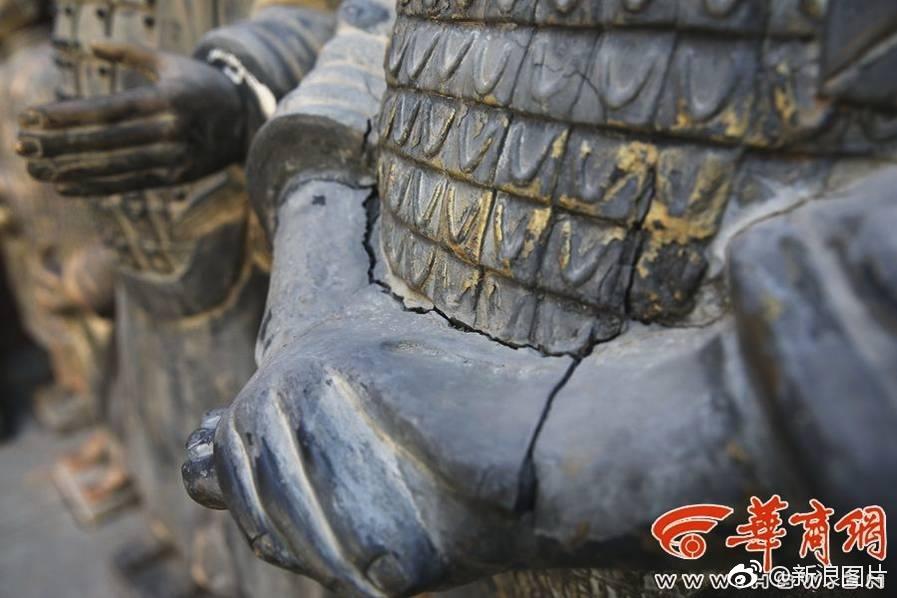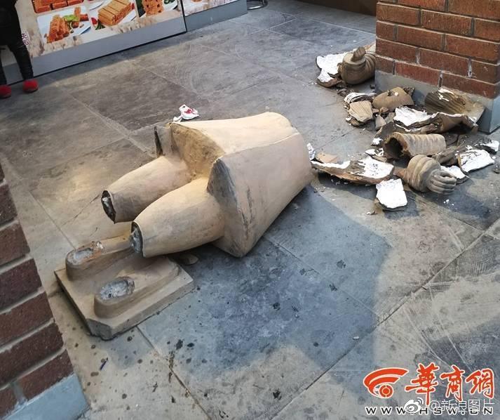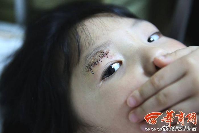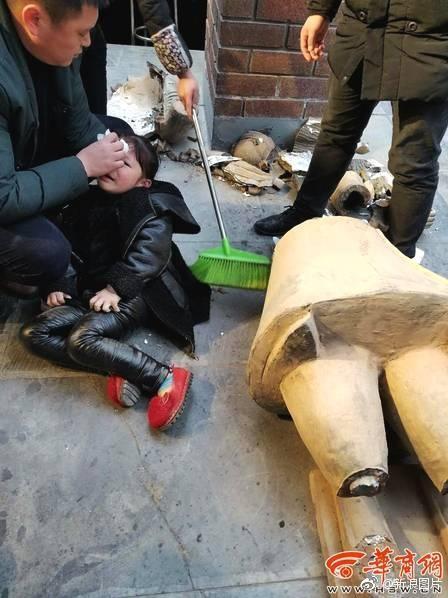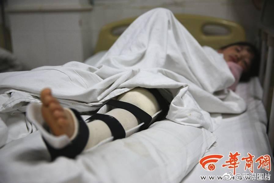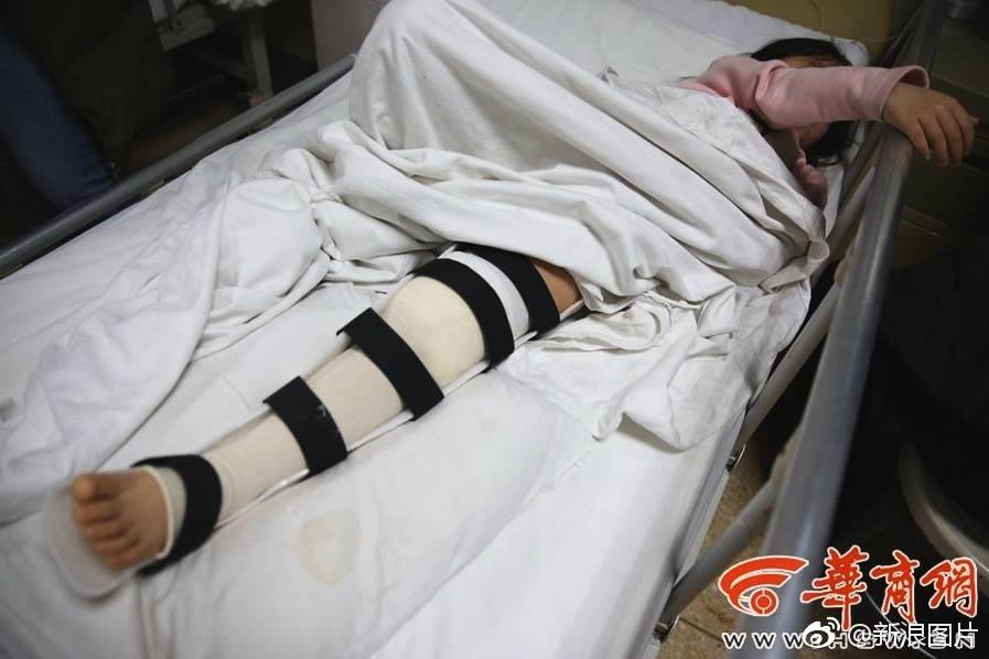 小女孩萱萱的左腿装着支架,固定了起来,膝盖明显隆起,右眼上方缝了八针。医生说,萱萱右眼外伤,左股骨干骨折,至少一个月后才能取掉支架,三个多月才能下地,之后还要及时复查。原来在18日,一家四口观看了兵马俑后来到商业街一家玉器店,萱萱被兵马俑砸伤。
