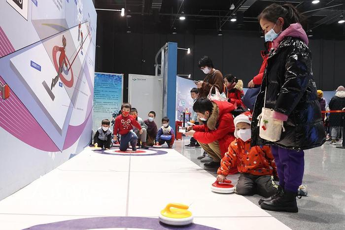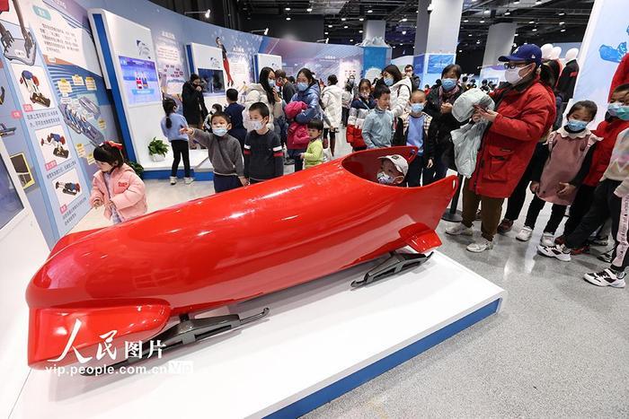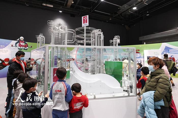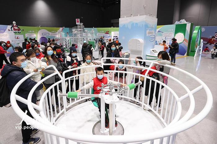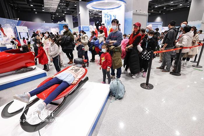 2022年2月17日,众多观众排队在中国科技馆“冬梦飞扬——中国科技馆科技冬奥主题展览”参观体验。展览设有“冬奥之约”“冰雪之魅”“运动之秘”“科技之力”“未来之城”五个主题展区及序厅、冬残奥会展示区、教育活动区三个展示交流区,并结合5G、4K、VR等现代技术手段,为观众营造一个参与、互动、体验的科技冬奥冰雪世界。陈晓根摄(人民图片网)