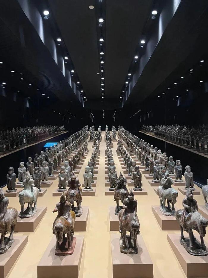 展出的司马金龙墓陶俑阵,分为6种人物、8列摆布,高度约在30cm左右。按照当时贵族出行的仪仗规制排列着导骑俑、骑马仪卫俑、步行仪卫俑等,表情生动、气势恢宏,尽显王家气象,是迄今为止北魏时期阵容最大的俑阵。