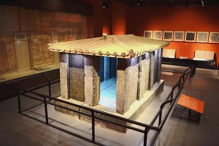 这尊石椁为青石材质由34块青石壁板及倚柱组合而成,整体高1.98米 底座长3.45米 宽2.08米。石椁呈庑殿顶房屋形状分为屋顶、中部和底座3层,顶部由5块青石做出屋顶的形状。