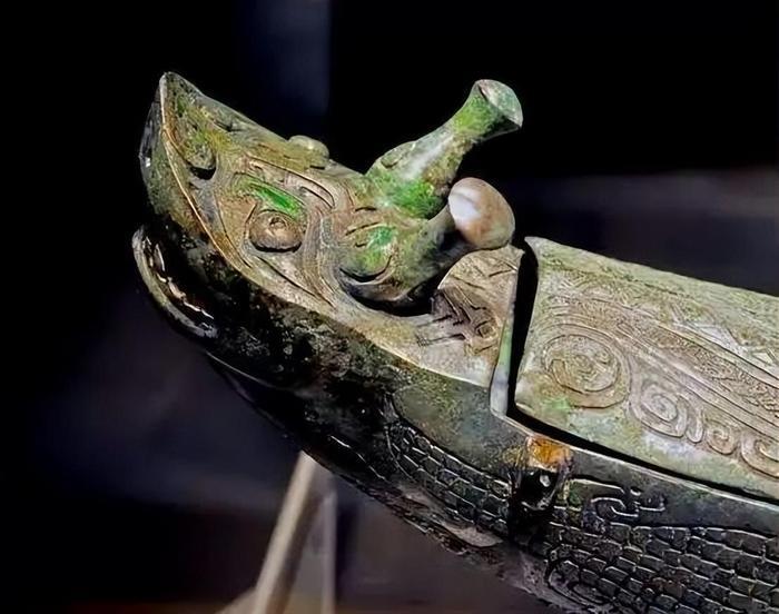 最为可贵的是,龙形觥独特的造型与花纹装饰与同时期典型的中原文化风格相区别。在它的装饰花纹中,惊人的出现了鳄鱼的形象,这在国内的青铜器中是独一无二的