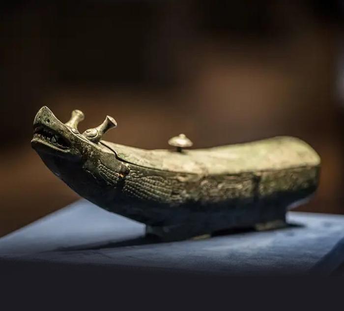 龙形觥1959年出土于石楼县桃花者村,是一件商代用来罚酒的器具,因外形宛如一艘停泊在水波里的龙舟,被学界命名为“龙形觥”。这件觥中孤品是山西青铜器的代表之作。
