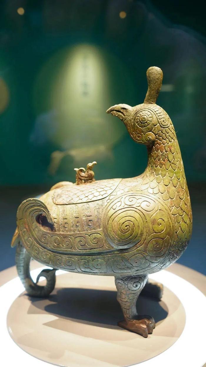 晋侯鸟尊作伫立回首的凤鸟形,凤是中华先民的古老图腾,承载了中华民族的精神内涵和审美内涵,华美的造型和实用功能在它身上完美结合,是中国青铜艺术品中的罕见珍品。