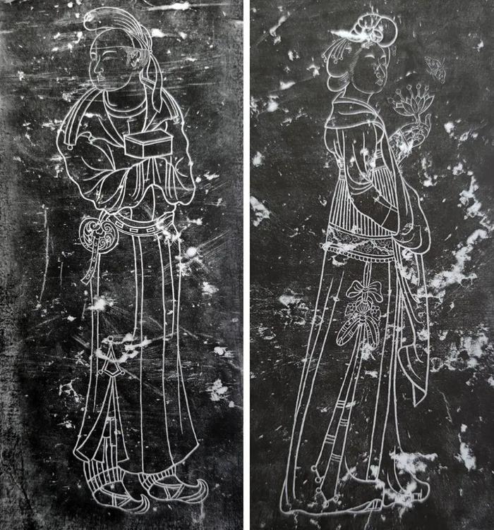 石椁中部由10块壁板、10根青石倚柱相隔围立而成,壁板内外刻有门窗和仕女图等精美图案,整体繁复精细的构图风格,为墓主人勾勒出一个奇异绚烂的梦幻世界。
