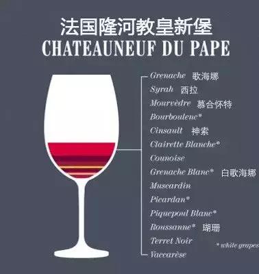 法国隆河葡萄酒混酿葡萄种类:歌海娜, 西拉, 维欧尼, 慕合怀特,玛珊, 瑚珊 、