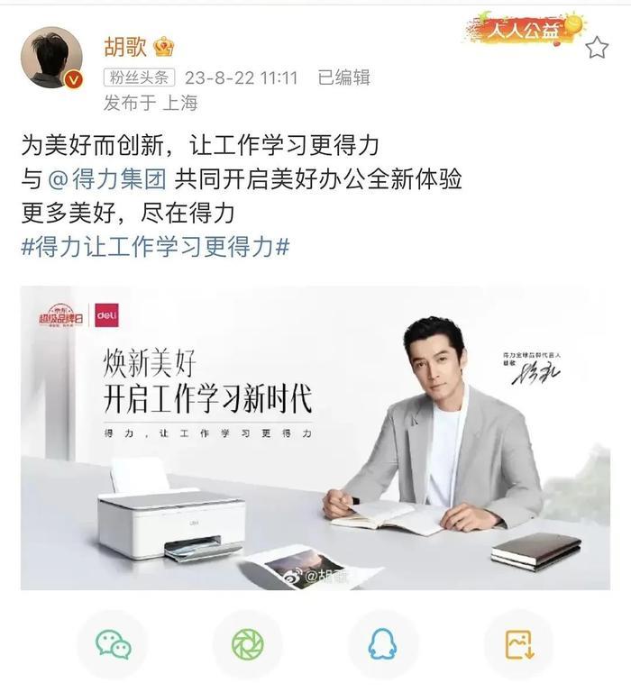 些许是因为粉丝火力太猛,胡歌第二天中午悄咪咪发了条广告,“想退圈”的一只脚又偷偷迈回去了~