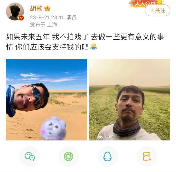 原因是前一天深夜,胡歌突然发微博暗戳戳地问:“如果未来五年我都不拍戏,做更有意义的事,你们会支持我吧”~