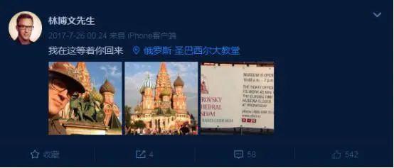 2017年7月,林博文在俄罗斯圣巴西尔大教堂写下微博:“我在这里等着你回来。”