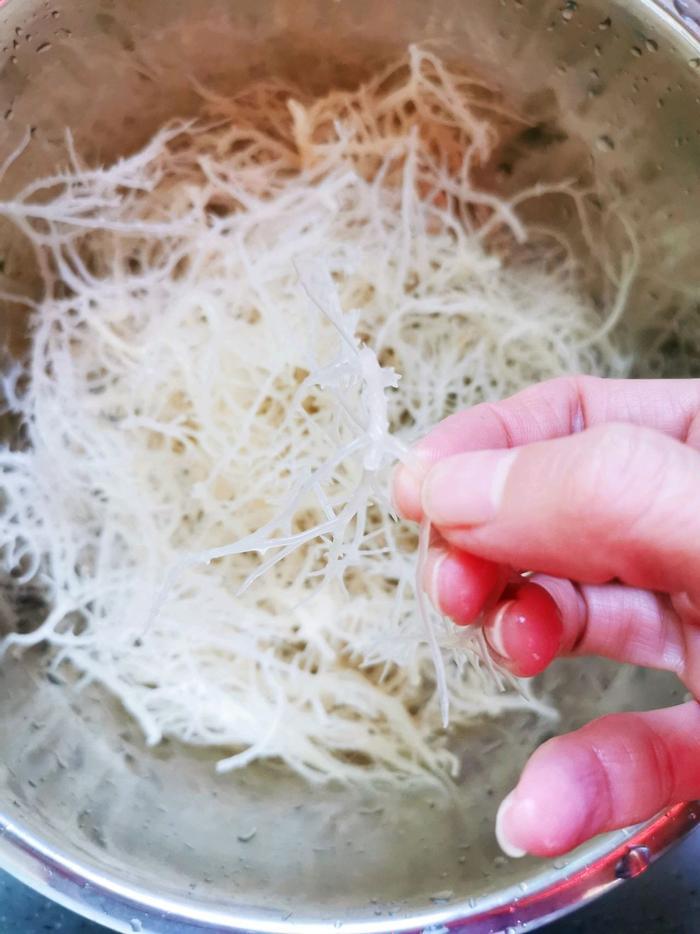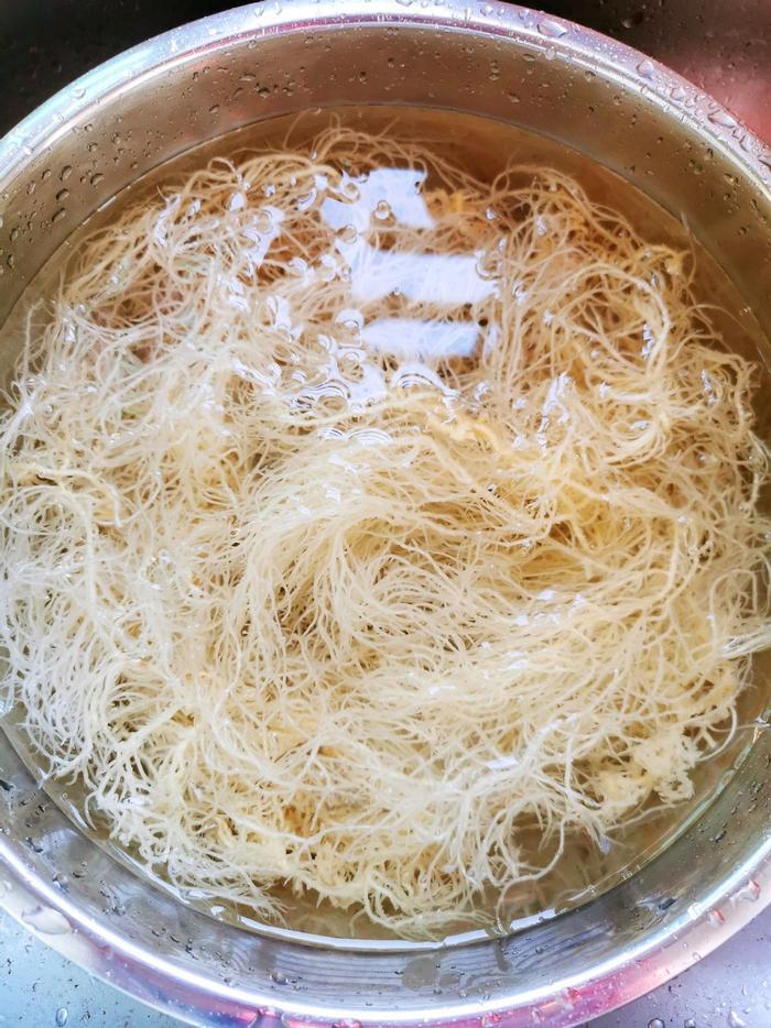 步骤1、首先我们来提前准备干海石花,将购买的干海石花放入盆中,注入冷水浸泡二十分钟左右的时间,随后不断冲洗干净即可备用。