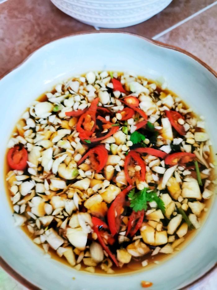 步骤4、生蒜剥好切碎,小米辣切碎,放入小碗中,加入生抽、白糖、食醋、辣椒油和香油等备用。起锅热油,油温上升以后直接泼入调料碗中搅拌均匀。