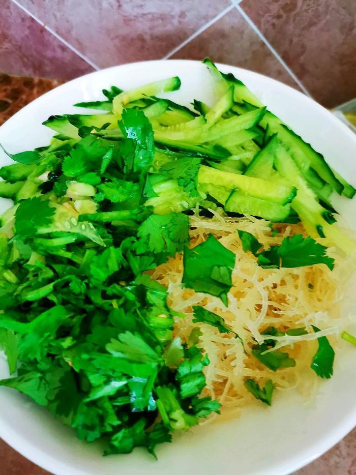 步骤3、随后将香菜摘好,清水洗净后切成小段,黄瓜洗净后切丝,全部放入海石花的盘中备用。