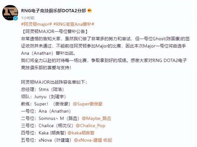 RNG此前官方消息已经表示队伍的一号位选手ghost签证没能通过将会寻找替补来参加比赛,一时间哪位选手会成为这名救火队员成为了大家关注的话题,毕竟RNG的积分距离直邀TI差距不大,如果找不到好的人选最终未能拿到足够的积分会让今年参加TI的中国队伍少一支,无论是对于RNG还是观众来说都无法接受。就在昨天RNG战队官方微博发文官宣消息:“非常遗憾的告知大家,虽然我们做了非常多的努力和尝试,但一号位Ghost(陈国康)的签证依然并未通过,不能前往阿灵顿参加Major的比赛,因此本次Major一号位将由选手Ana(Anathan)替补出战。 我们将全力以赴的对待每一场比赛,争取拿到好的成绩。感谢大家对RNG DOTA2电子竞技俱乐部的喜爱与支持!