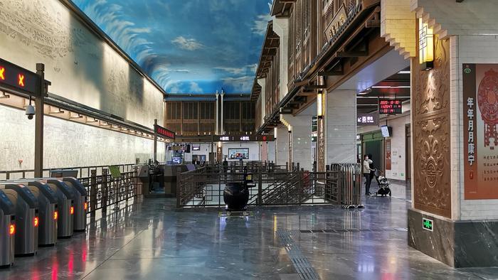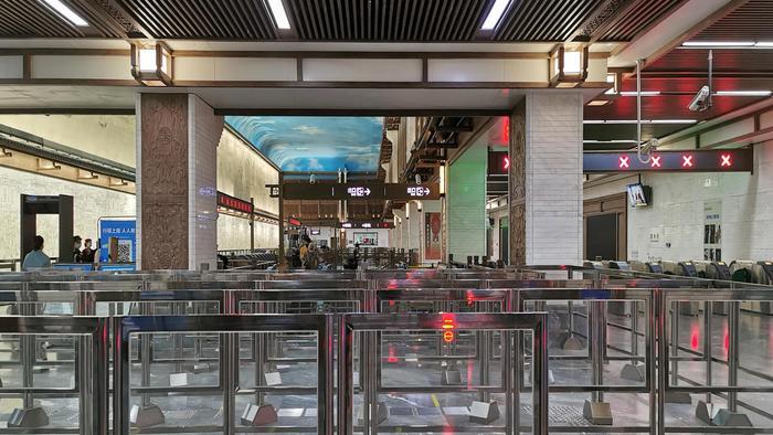 说汉正街别样的感觉,是站内装修风格的不同。从列车上走出来,首先映入眼帘的是站台比较古色古香的感觉,这与普通地铁的风格完全不一样。从自动扶梯上往上走,抬头望去,突然感觉好似在露天中,头顶上蓝天白云的房顶设计,与大自然的蓝天白云感觉没什么两样。