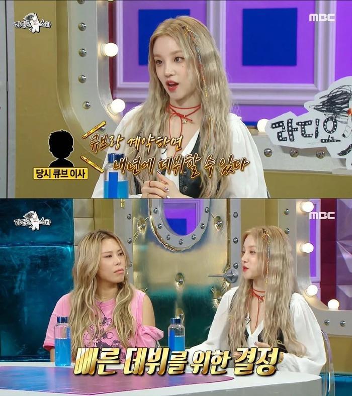 金九拉问道:“那你为什么要去SM?”,宋雨琦说,SM是一个梦想,当时cube有一个女团4Minute,我喜欢它,我喜欢girl crush,所以很苦恼。虽然我的脸蛋长得漂亮可爱是SM相,但声音实在是CUBE,有点沙哑。而且当时cube的导演说,如果你和我们公司签约,明年就可以出道,所以我选择了cube。