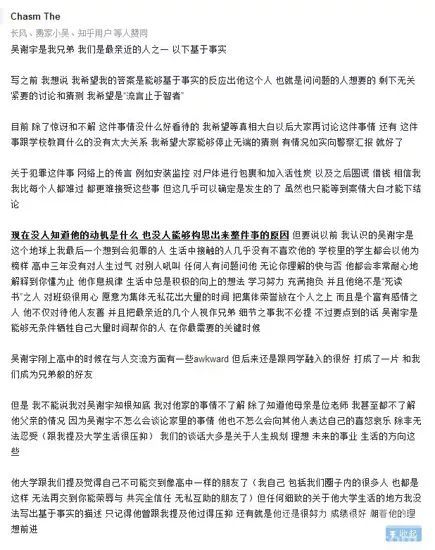 这是知乎上别名喊“Chasm The”的用户对于吴谢宇最单刀直入的评介,他自称是吴谢宇的佳伯仲,共时也是他的高中共学。