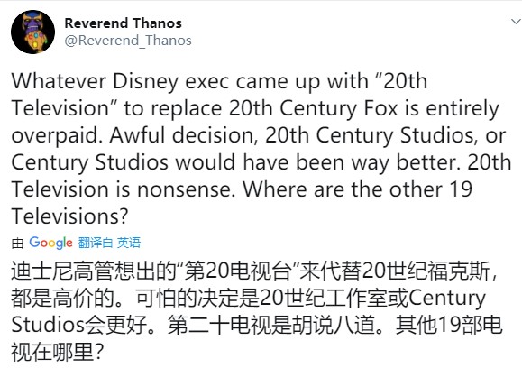 还有人以为,迪士尼的更名“20th Television”(第二十电视,暂译)也很值得吐槽。最先,既然更名,何以不改成21世纪,而是要保持20这个数字?其次,网友指出,迪士尼抹去“世纪”字眼也让人摸不着脑筋:“既然是第20个电视,那其余19个在何处?”