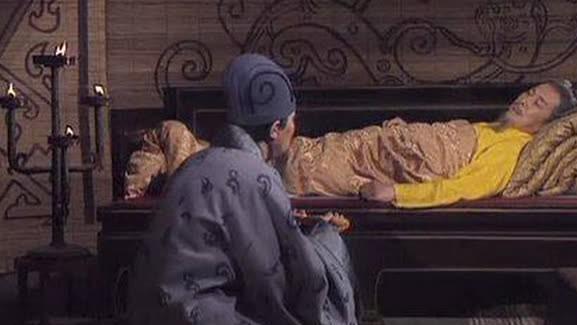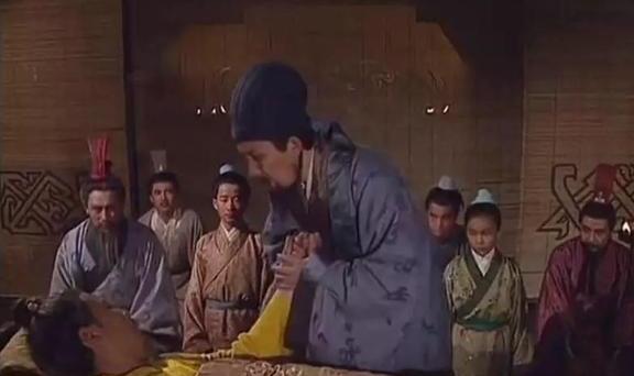 刘备让孔明坐于龙床左右,而后拉着孔明的手,一面哭一面说: