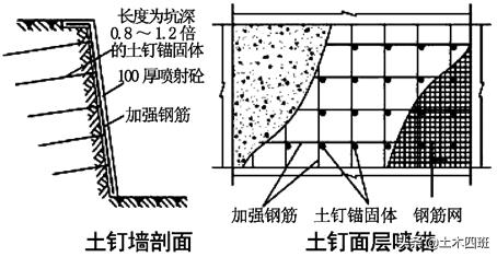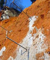 天然土体通过钻孔、插筋、注浆来设置土钉(亦称砂浆锚杆)并与喷射砼面板相结合,形成类似重力挡墙的土钉墙,以抵抗墙后的土压力,保持开挖面的稳定。也称为喷锚网加固边坡或喷锚网挡墙。