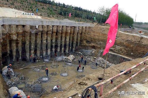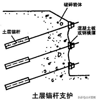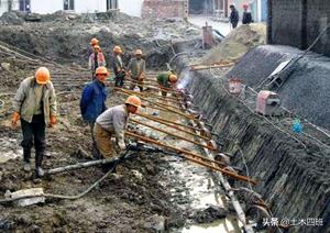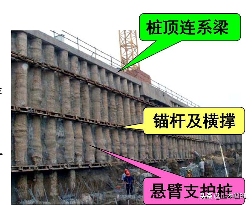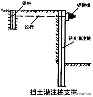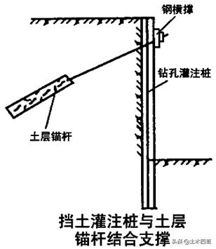 桩顶不设锚桩、拉杆,而是挖至一定深度,每隔一定距离向桩背面斜向打入锚杆,达到强度后,安上横撑,拉紧固定,在桩中间挖土,直至设计深度。