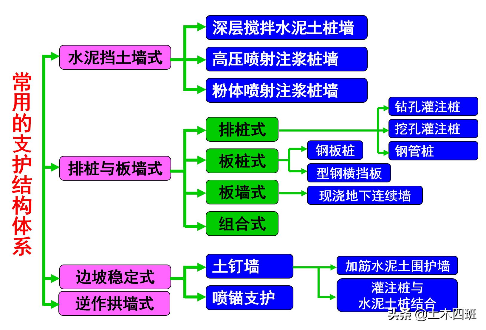 由支护桩或墙和内支撑组成,适用于各种地基土层,缺点是内支撑会占用一定的施工空间。