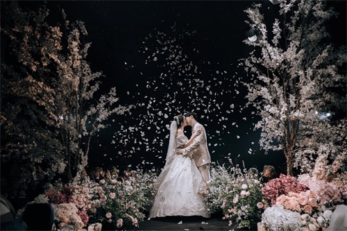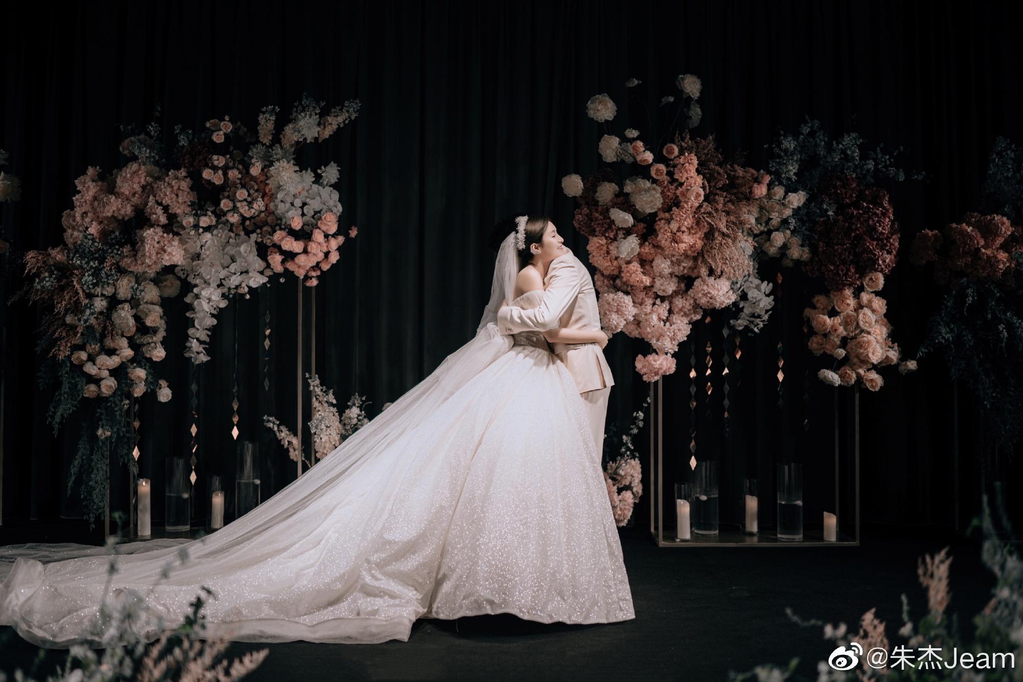 同一时间,新郎官朱杰亦是在社交网隔空呼应太太的表白,贴文表示“这些年,让爱我的朋友们等久了,感谢”!画面中,只见身穿一袭米色西装的帅气新郎与披着洁白婚纱的美丽新娘置身于花海中浪漫拥吻,接受台下双方亲戚及亲朋好友的祝福声,羡煞旁人!