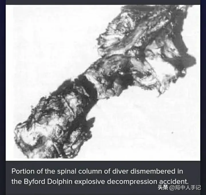 3.特鲁斯·赫列维克(Truls Hellevik),挪威潜水员,在Byford Dolphin石油平台工作。1983年5月11日,当他和另外三个人在一起的房间突然减压时,他被从一个60厘米宽的洞里猛烈地吸了出来。