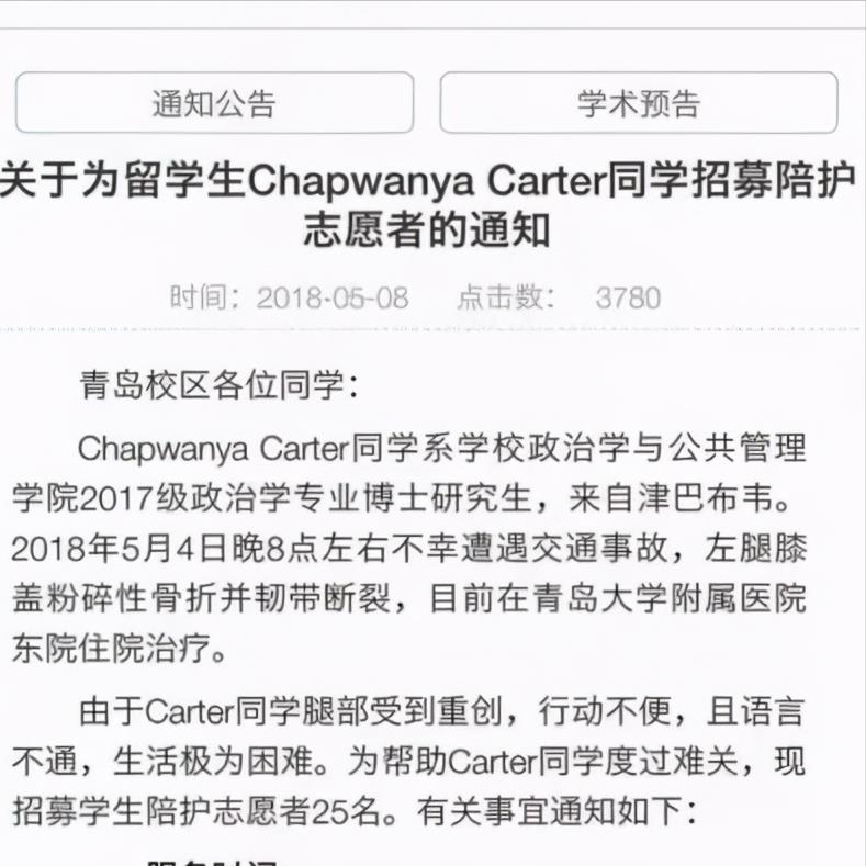 4.山东大学,曾有1名留学生骨折住院,学校专门发通知招募25名志愿者陪护。1名留学生骨折,却要找25名陪护,是不是有些太过了,这放在以前得是多大的官,才能有这么多人来照顾?