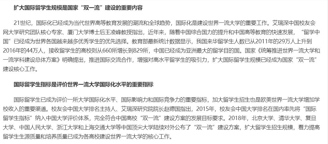 文章指出,国际留学生已成为评价一所大学国际化水平、国际影响力和国际竞争力的重要指标。而这个指标中国学生是无法帮忙完成的。而从高校世界排名来看,中国学校排名普遍靠后。