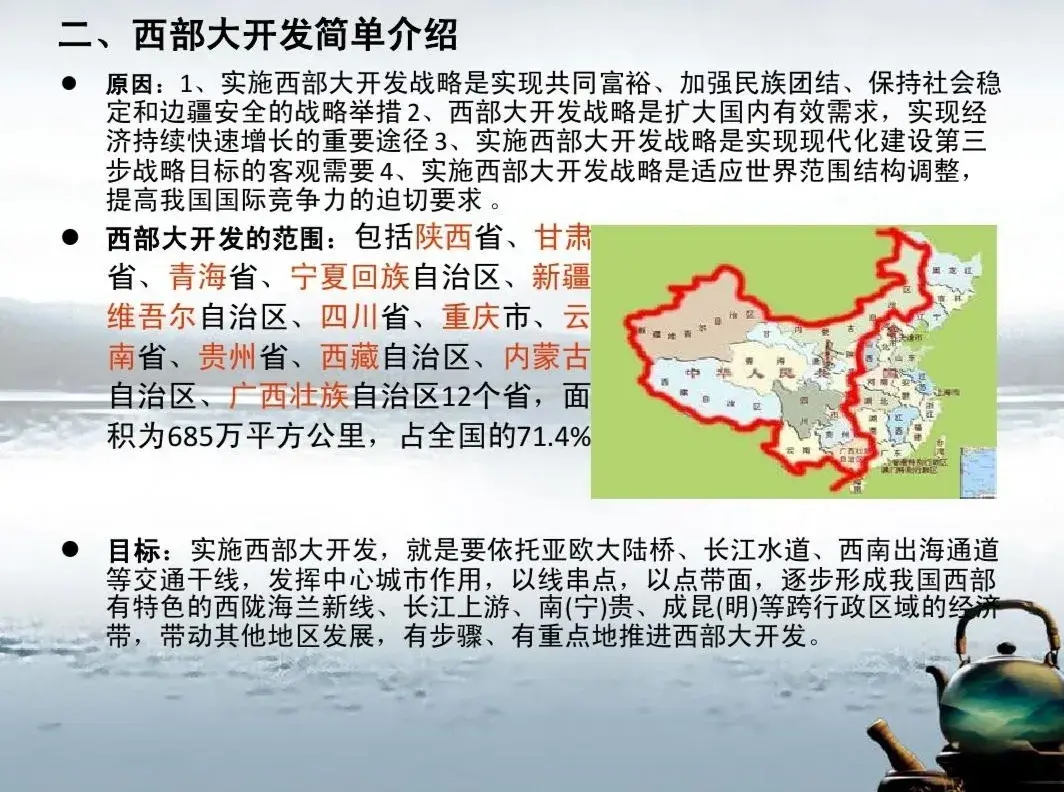 7.西部大开发:是我国旨在提高西部地区的经济和社会发展水平,工程总投资超过8500亿元。