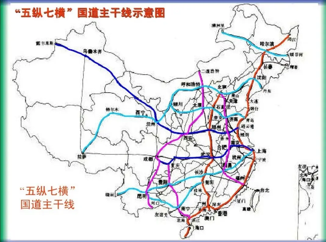 6.五纵七横过道主干线:是我国最大的公路网,总路程约3.5万公里。耗时30年,耗资9000亿。