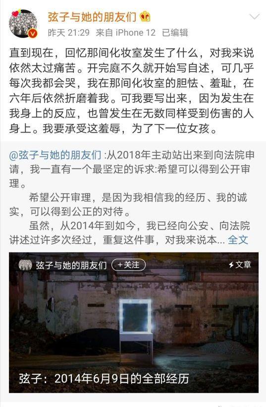 2018年7月,弦子发长文称,4年前自己在央视实习期间,遭到主持人朱军性骚扰。2018年10月25日,弦子向海淀区法院控告朱军,2020年12月2日下午,该案正式开庭,当日未宣判。这个案子掀起了轩然大波,朱军也是一度消失在公众面前。
