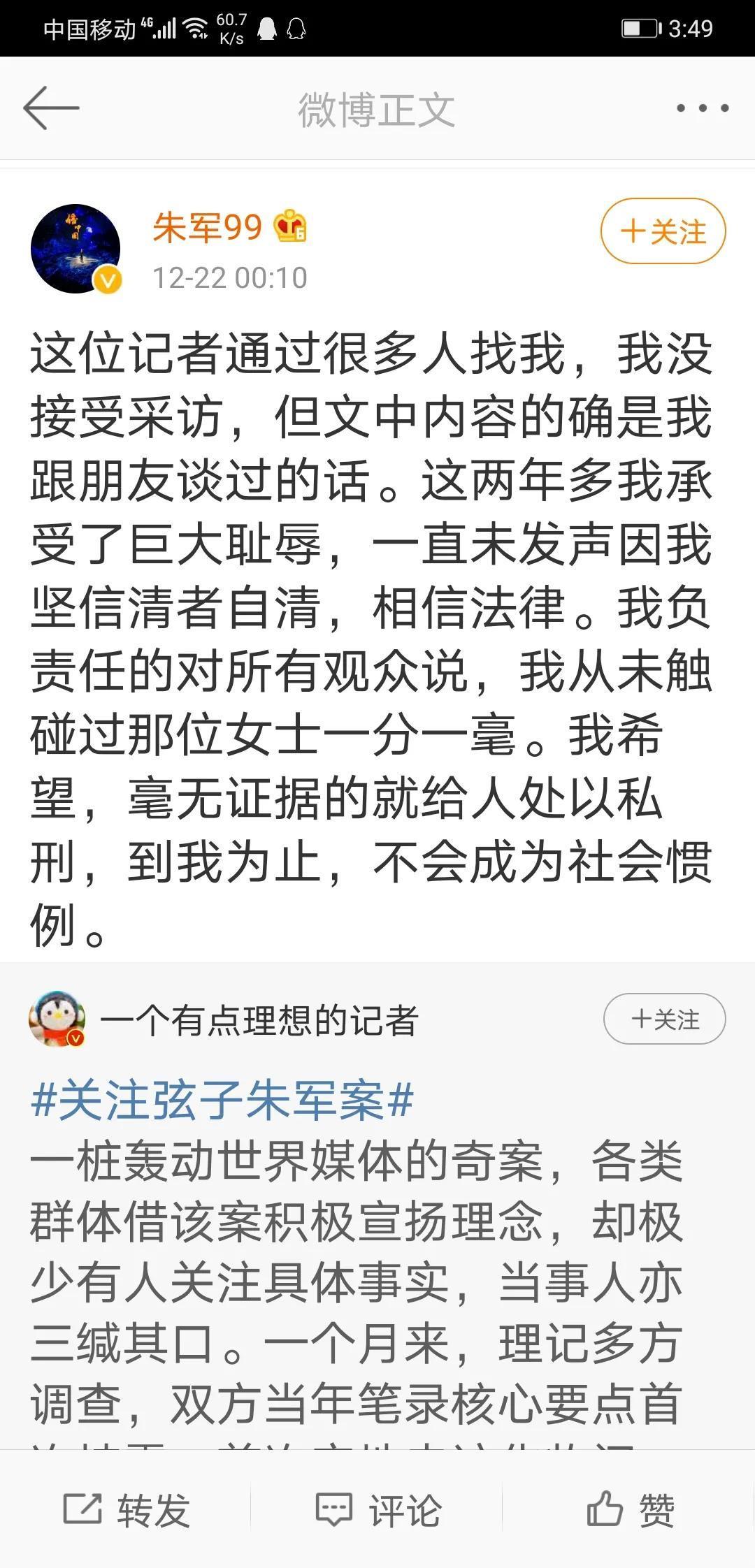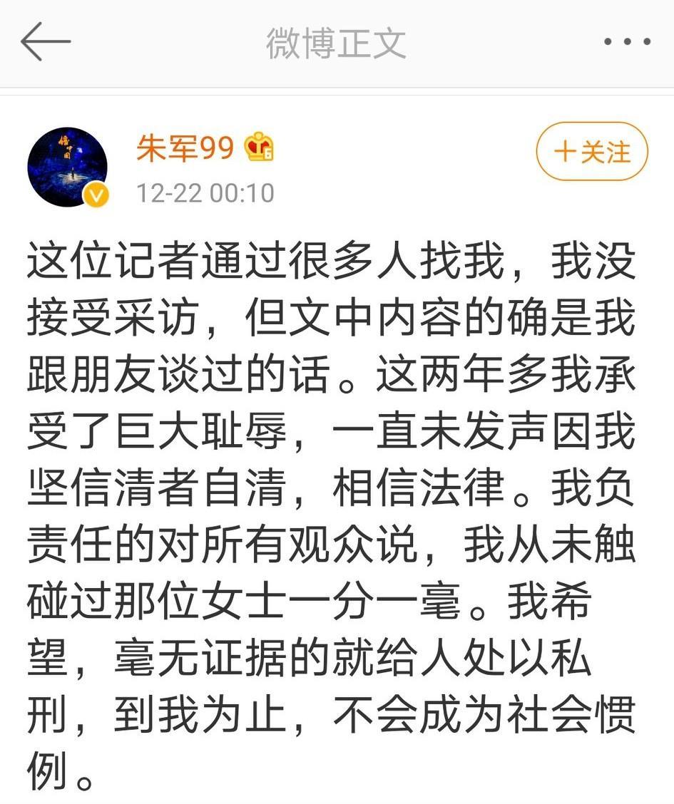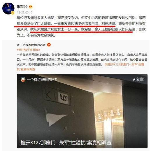 在被弦子起诉性骚扰成功立案后不久,12月21日晚,朱军首次回应:这两年多我承受了巨大耻辱,一直未发声因我坚信清者自清,相信法律。我负责任的对所有观众说,我从未触碰过那位女士一分一毫。我希望毫无证据的就给人处以私刑,到我为止,不会成为社会惯例。