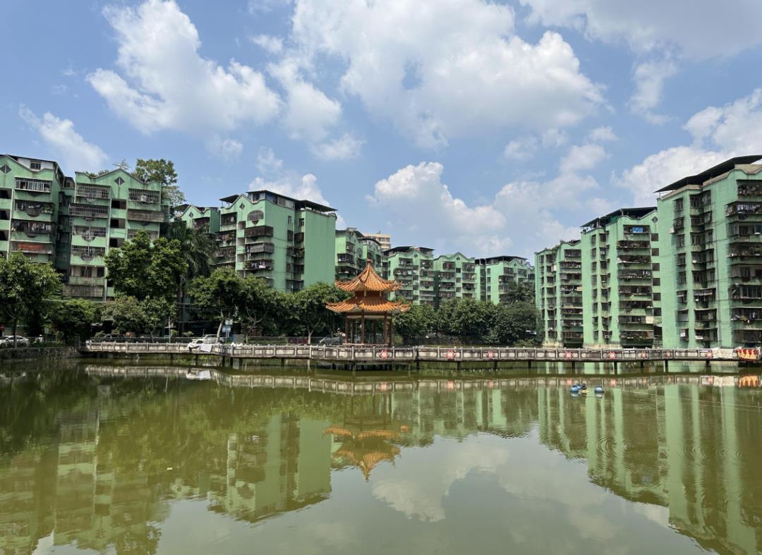 这个人工湖的面积很大,湖中央有凉亭和连接外边的廊桥。在90年代初期,能建这么大的人工湖,挺不可思议的。因为人工湖的物业维护成本极高。而美丽看到,小区还有不少楼栋直接“泡在”了水里,这就更离谱了。
