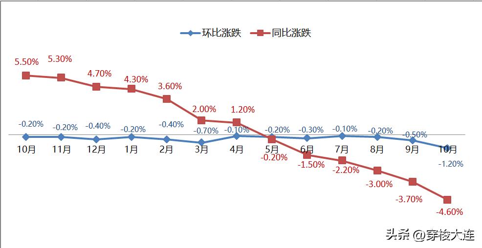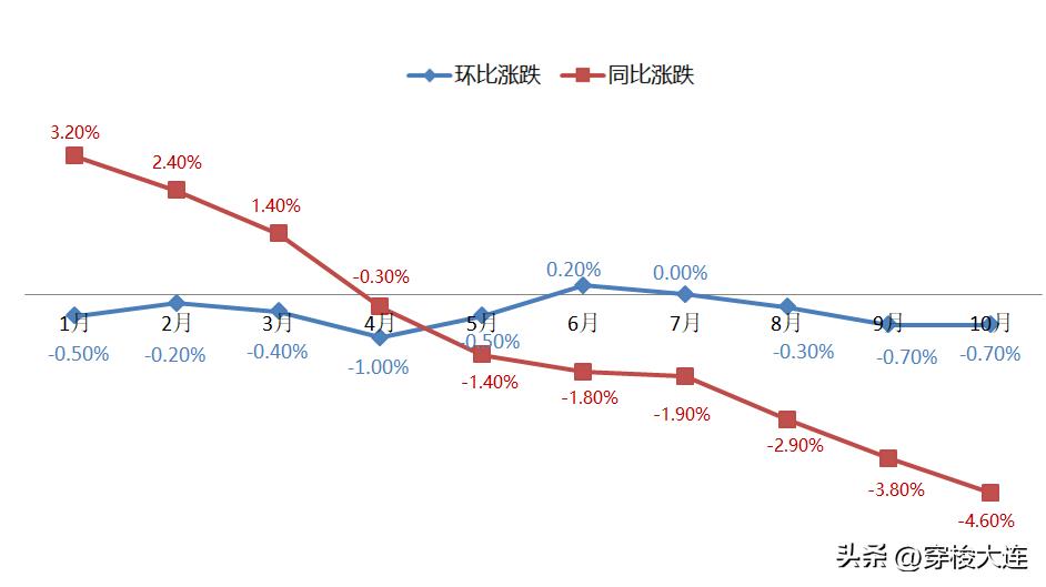 另外,大连10月新房价格同比去年10月跌幅也仍旧在扩大,10月环比去年新房价格已经跌掉了4.7%。