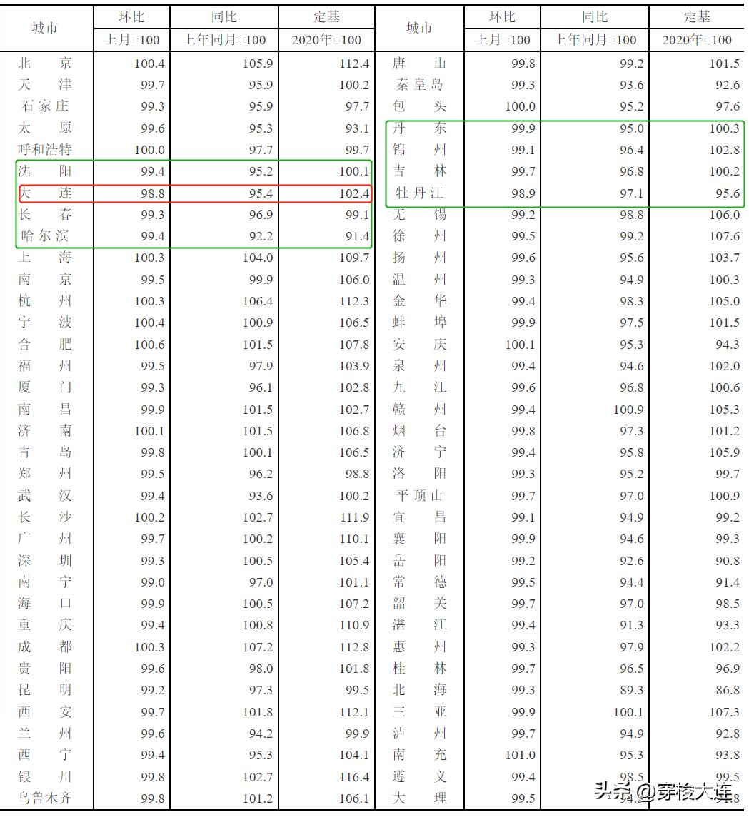 其中大连跌幅最大,达到了跌1.2%;牡丹江紧随其后,跌幅为1.1%;长春跌幅0.7%,哈尔滨、沈阳环比跌0.6%。
