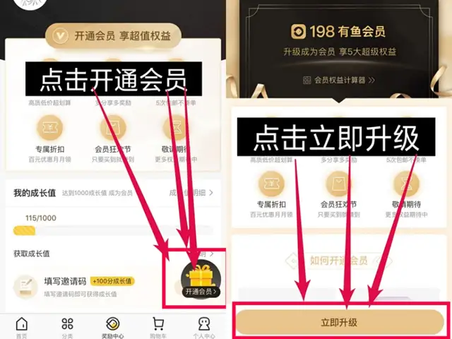 第三步,点击奖励中心~开通会员~立即升级~选择礼包~购买,购买成功即可成为有品有鱼会员,享受会员基础权益,以及自购省,分享赚。(也可以先通过第四步找到邀请人,了解小米有品有鱼之后,再开通会员),开通会员之后,就会获得自己专属的邀请码(UP43U10N)