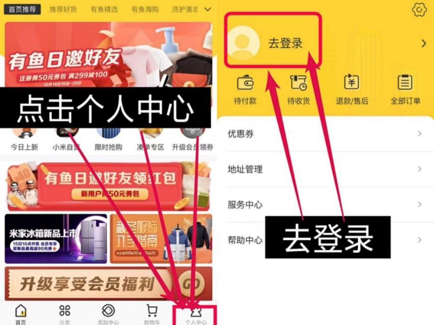 第二步,打开APP,点击个人中心,登陆(建议微信直接登陆),填写邀请码UP43U10N,即可注册成功,此时就可以在在有品有鱼里购物了。
