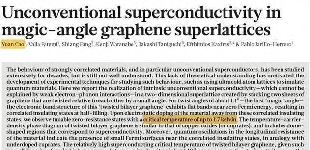 这件事情已经发生在去年,媒体曾经大肆报道过,但后来渐渐淡出人们的视线,不过最近却再次引起热议。然而,需要明确的是,科学界至今尚未实现常温超导技术。假设有一天某位科学家成功实现了常温超导,即在室温范围内,这将是一个巨大的突破。即使这一刻来得有些晚,也能赶上未来的进展,因为这对人类将产生深远的影响。值得强调的是,曹原的研究只实现了低温超导,工作温度为1.7开尔文,相当于零下271摄氏度。要在商业领域应用这一技术存在一定的困难,但在实验室条件下是可行的。然而,一些观察家提出了疑问,为什么石墨烯的超导性引起如此广泛的关注?是否因为涉及到中国科学家?事实上,曹原的国籍和石墨烯超导的研究在国内引起了广泛的关注。这也为科普教育提供了良好的机会。