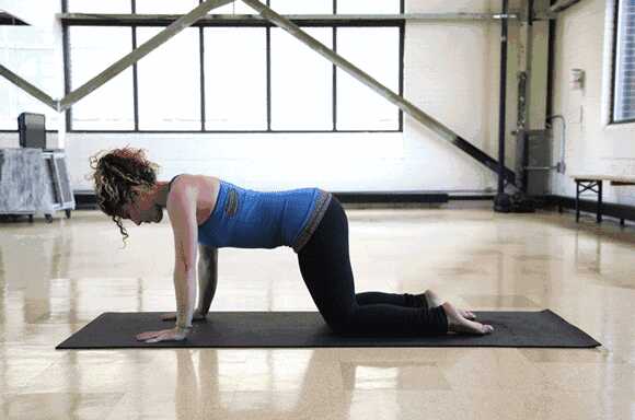 要点1:下犬式可以趴在地面上开始,先四角跪姿准备,双手双脚打开与肩同宽,双手在双肩的正下方,双膝在髋部的正下方;