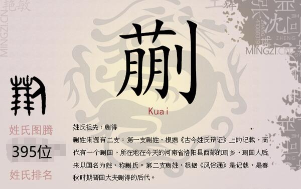 蒯(kuǎi)姓,一种较少见的中国姓氏,目前在百家姓中排395位,因为全人口稀少,所以很多人应该没有见过姓蒯的人。蒯姓起源和来历主要有三:一是出自商朝,以国名为氏;二是出自蒯得的后代,以邑名为氏;三是出自姬姓,以祖字为氏。