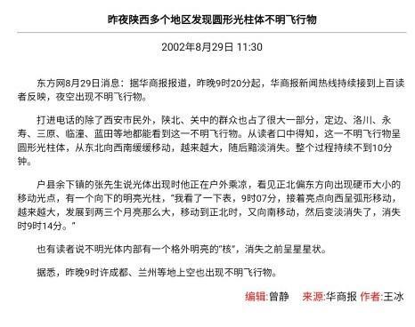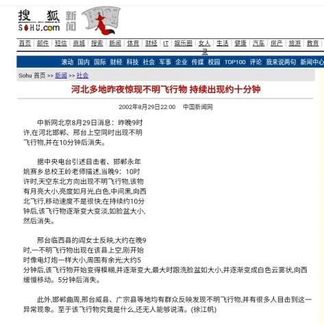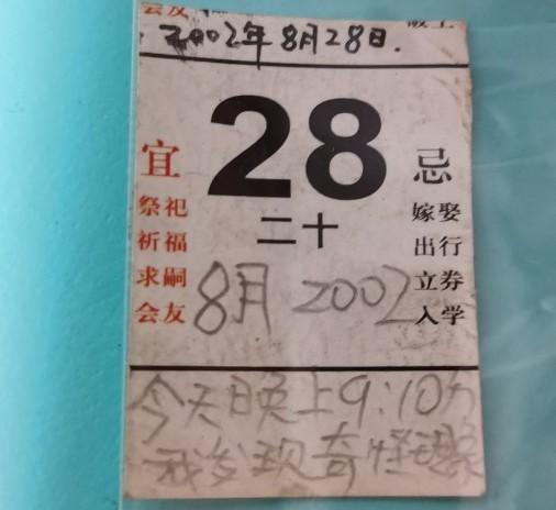 第二天,2002年8月29日的《楚天都市报》就6报道了8月28日晚9点多钟发生在河南、河北、山东上空出现不明飞行物的事件,当时有很多市民目击了这一现象。我的所在地在湖北荆州,我所看到的天边正好和报纸上报道的方向一致。当时为了记载这件事,特意剪下了当天的日历页,作了记载。