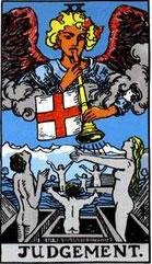 米迦勒另外一个身份是在“最后的审判”中,作为守护光明的天使,为死去的灵魂引路(另一说是在世界陷入混乱时,他必会出现,引导世人)。因此,在塔罗牌中,他有着吹响末日号角,使死人“复活”的形象。而张牌的名称,也是“审判”。