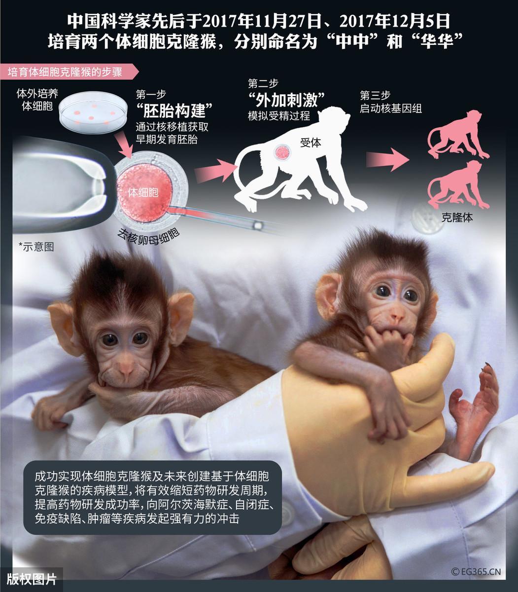 1996年世界第一只克隆羊诞生,预示着动物体细胞的细胞核可以培育出一只完整的动物。2017年11月27日世界上首个体细胞克隆猴“中中”在位于上海的中国科学院神经科学研究所、脑科学与智能技术卓越创新中心的非人灵长类平台诞生;12月5日第二个克隆猴“华华”诞生。