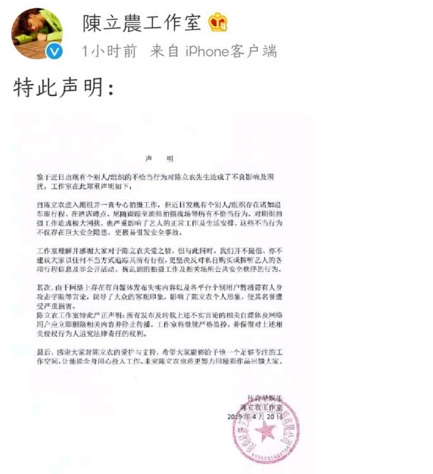 4月20日,陈立农工作室就针对个别私生跟车、跟酒店的行为进行了抵制,发布了声明。确实,疯狂的私生饭们这样的行为,不仅给陈立农的生活带来了麻烦,也给拍摄剧组带来了麻烦,让人非常反感。同时,陈立农工作室也对网上的谣言进行了澄清,希望自媒体能谨言慎行,不要随意散布不实言论!
