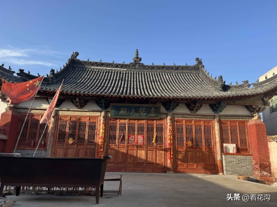 31.镇平县的名胜古迹-卢医庙大殿。卢医古庙现存卢医庙大殿及两侧廊坊。大殿深三广五,单檐歇山,四角起翘,抬梁柱式,檐式斗拱,灰色铜瓦。卢医大殿为宫殿式风格,砖木结构,圆木杰柱,九架九檩,筒瓦拱顶,檐牙飞翘,风钟悬挂。殿内雕梁画栋,中间塑有扁鹊和孙思邈的神像,两侧分别是岐伯、华佗、王叔和、葛洪、陶弘景、朱丹溪、李时珍等。内壁绘有“扁鹊见蔡桓公”、“张仲景坐堂行医”、“孙思邈坐虎针龙”、“华佗刮骨疗毒”等壁画。卢医古庙前有“八”字墙,东边的碑墙有碑文记述着卢医庙的身世变迁。西边的碑墙是河南省文联副主席二月河题写的“悬壶之祖”四个大字。